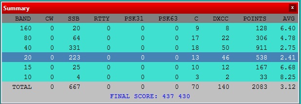 Conditions Key band was 40m followed by 20m. Amazingly good on 15m Sunday morning 09:00 to 10:30 but unfortunately no activity on SSB (CW skimmers were reporting good signal strength from EU to Asia and Pacific. Just 25 QSO, mostly with HB9. Highligts were to be called by H44MS, 4S7LF or by BI4WOP with 100W and a vertical antenna being his first QSO-ever outside of Asia.I was expecting more on 80m